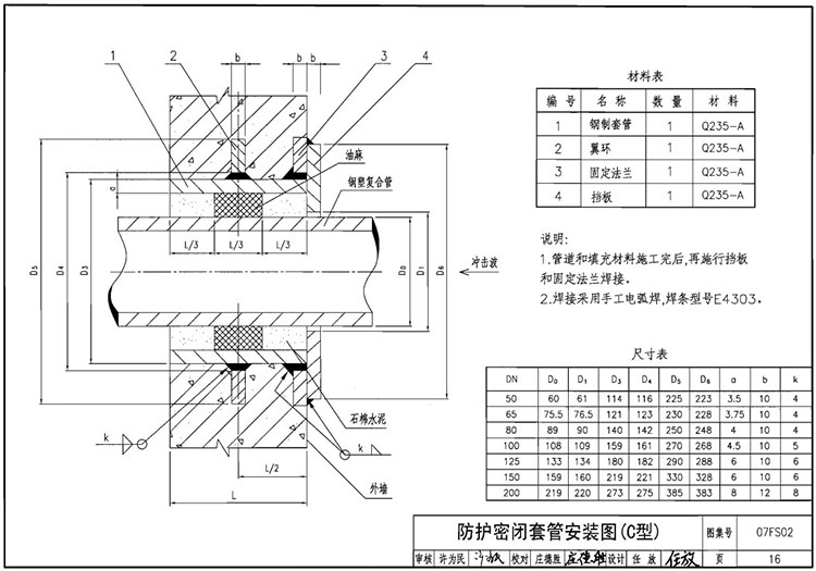 C型;鋼制套管 數量1材質(Q235A)翼環數量1 材質(Q235A) 固定法蘭 數量1 材質(Q235A 擋板數量1 材質(Q235A)說明;管道和填充材料施工完后,再施行擋板和固定法蘭焊接。